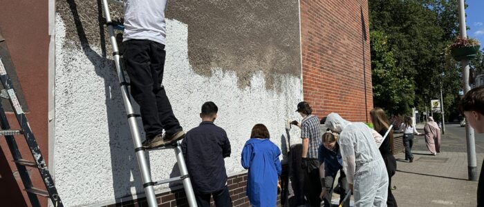 Bevor die Spraydosen zum Einsatz kamen, tauchten die Schüler*innen tief in die Geschichte der Graffitikunst ein: In einem spannenden Workshop – über den wir bereits berichtet haben – wurden zunächst künstlerische Grundlagen gelegt, Skizzen entwickelt und Techniken ausprobiert. Dann folgte der große Tag: ein ganzer Projekttag stand im Zeichen der Wandgestaltung – mit beeindruckendem Ergebnis.
