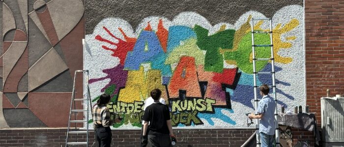 Wer in den letzten Tagen an der Musfeldstraße direkt an unserer Schule vorbeigegangen ist, dem ist sicher das farbenfrohe neue Wandbild ins Auge gefallen. Entstanden ist es im Rahmen eines besonderen Projekts, bei dem Schüler*innen des Projektkurses unter der Leitung von Frau Fleurkens und Herrn Wagner gemeinsam mit dem bekannten Duisburger Graffitikünstler Robin Meyer kreativ geworden sind.